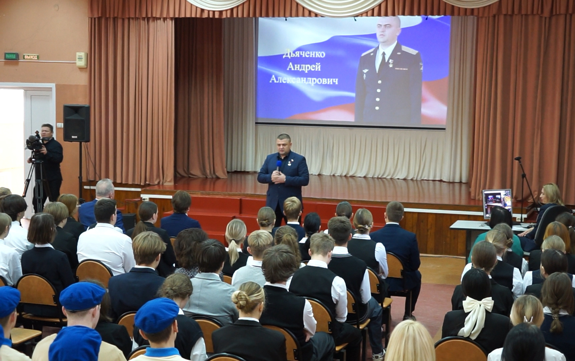 Андрей Дьяченко рассказал школьникам о своем жизненном пути — от детских мечтаний до службы военным летчиком. Он участвовал в боевых действиях в Сирии и в зоне проведения специальной военной операции, совершил более 50 боевых вылетов. В 2016 году указом президента РФ Владимира Путина был удостоен звания Героя России.